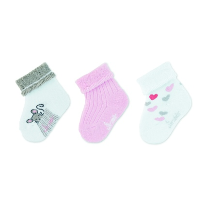 Sterntaler ponožky kojenecké s manžetkou, 3 páry, froté, myška, srdíčka, bílé 8302123
